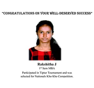 2. 'Rakshitha A, student of first semester MBA, participated in Tiptur tournament and was selected for Nationals Kho-KHO competition and was named GOLDEN PLAYER'.