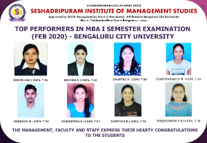 1. Bengaluru City University announced the results for the I Semester Examinations held in the month of February/March 2020. The students have performed exceedingly well with 8 students securing First Class Distinction in the examinations.